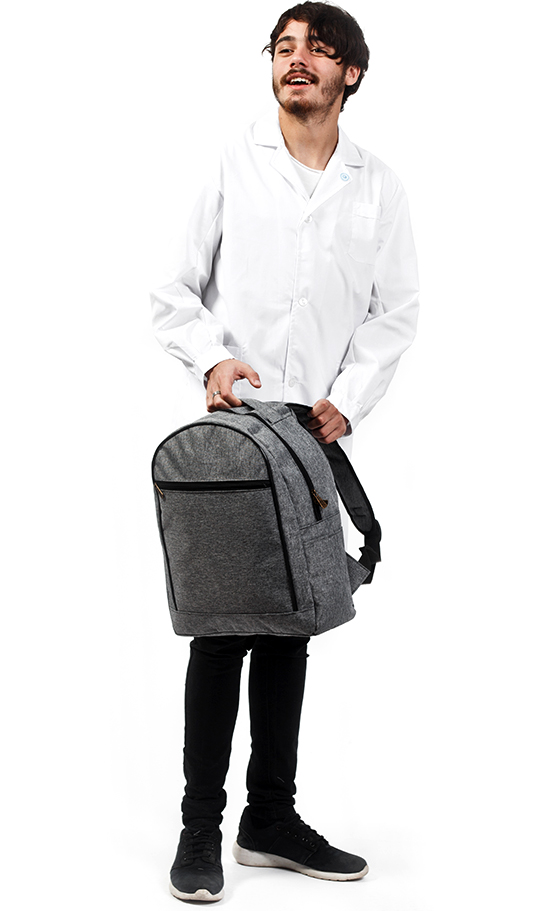 Espaldin: Aplicado al cuello, adheridas tres etiquetas, una con la marca de la prenda, otra con la marca de la tela, composición, instrucciones de lavado y país de origen y un cartón en tinta indeleble indicando el artículo y talle.